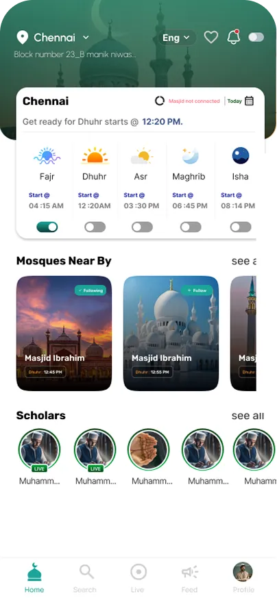 Automated and live streaming of Adhan from local masjids.